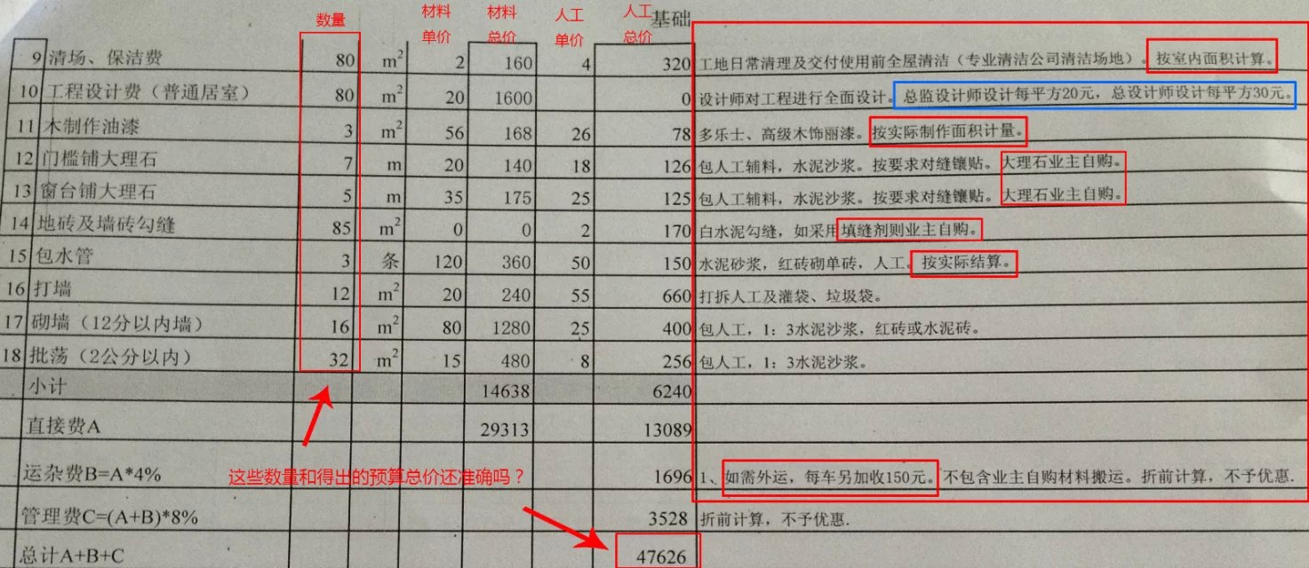 第二,備注里有很多價(jià)錢說明。最后業(yè)主的結(jié)算會(huì)高于預(yù)算總價(jià)。